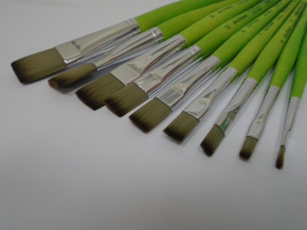 Špička štětce je zhotovena z jemného syntetikého vlasu zlatavé barvy a zasazena do bezešvé lesklé hliníkové násadky. Štětec je vysoce odolný proti opotřebení, plochý tvar umožňuje nanášení barev do větších ploch, je vhodný pro všechny druhy barev. Nyní Je žlutá žada postupně nahrazována zelenou.