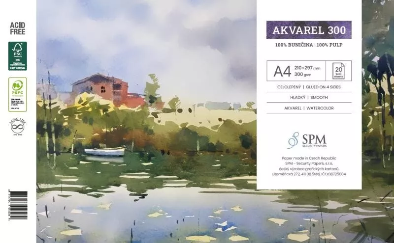 Akvarelový blok, 300g/m2, 20 listů, list má jemnou strukturu, celolepený, není nutno papír napínat na podložku, list papíru se po proschutí snadno odřízne. Vhodný i pro malbu v plenéru.